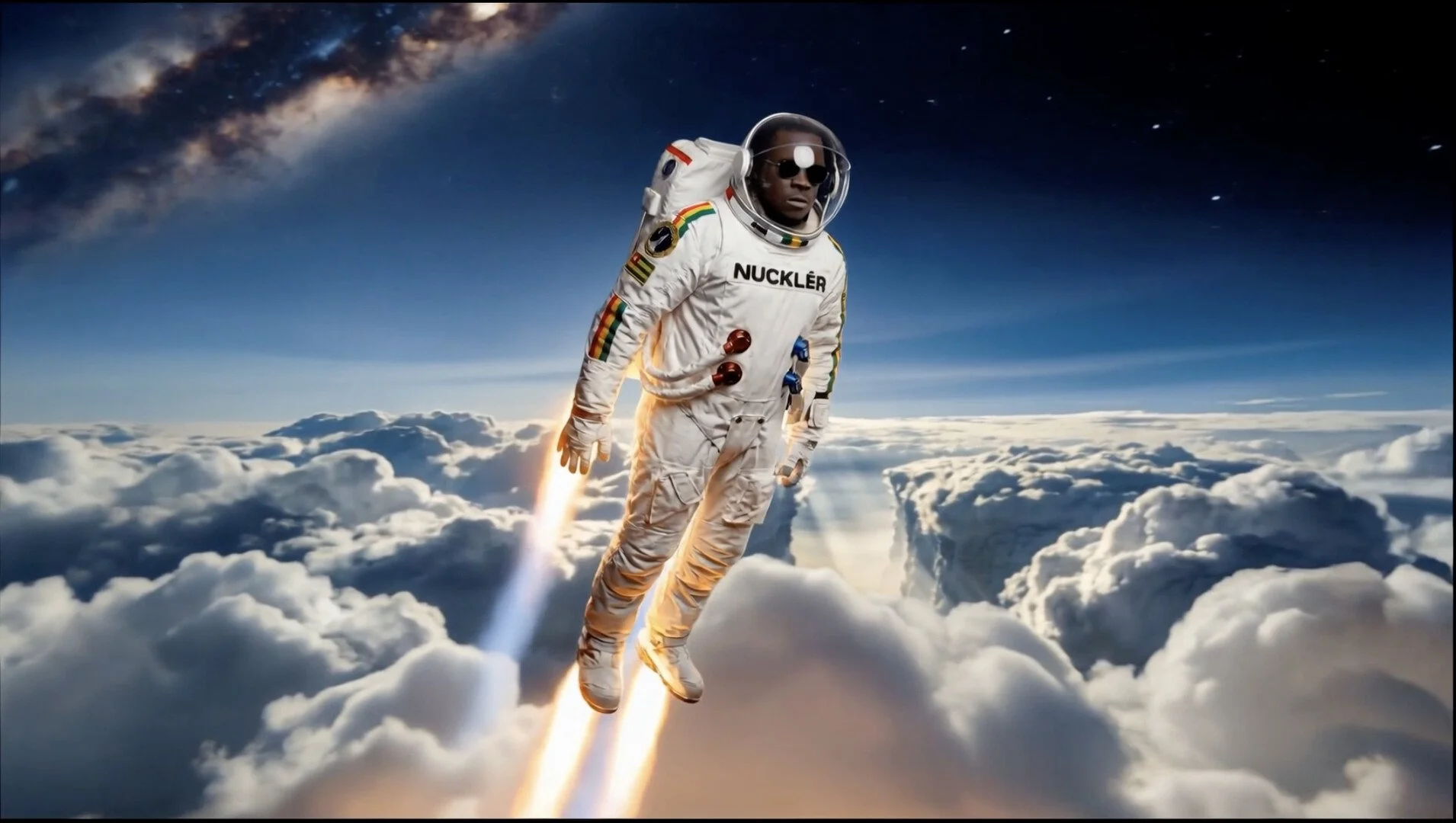 The audience's spirits were flying high with Afrobeats/Amapiano tunes that made my body want to wind from the first beat. This fast-paced AI music video follows NUCKLÉ'R, a Togolese astronaut who launches from Lomé using an Iron Man-style propulsion suit—no rocket, just raw power and vision. We watch the countdown in mission control, a supersonic ascent past planes and birds, a communications blackout in near-space, and finally, a historic lunar landing where he plants the Togolese flag with Earth glowing behind him.